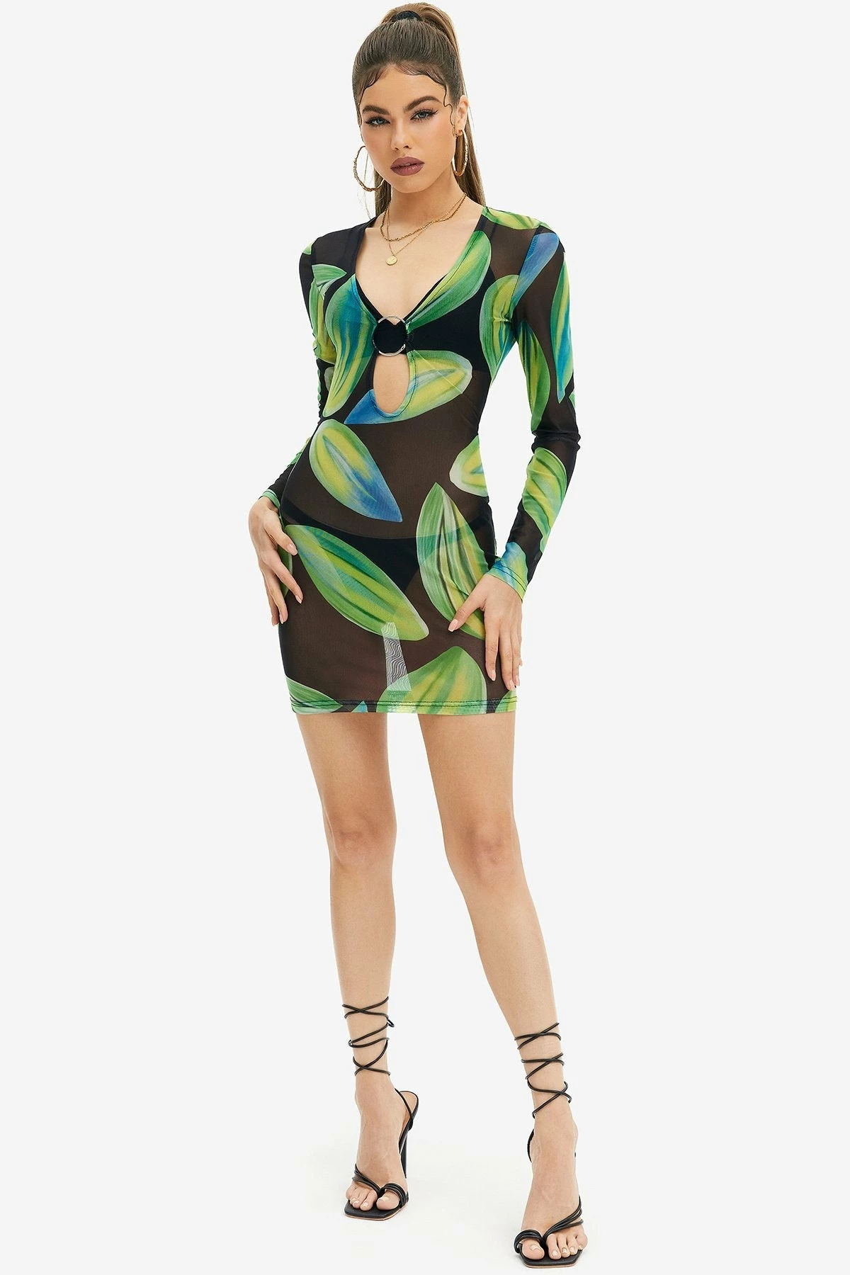 Solado Abstract Print O-Ring Front Mesh Mini Dress Without Underwear