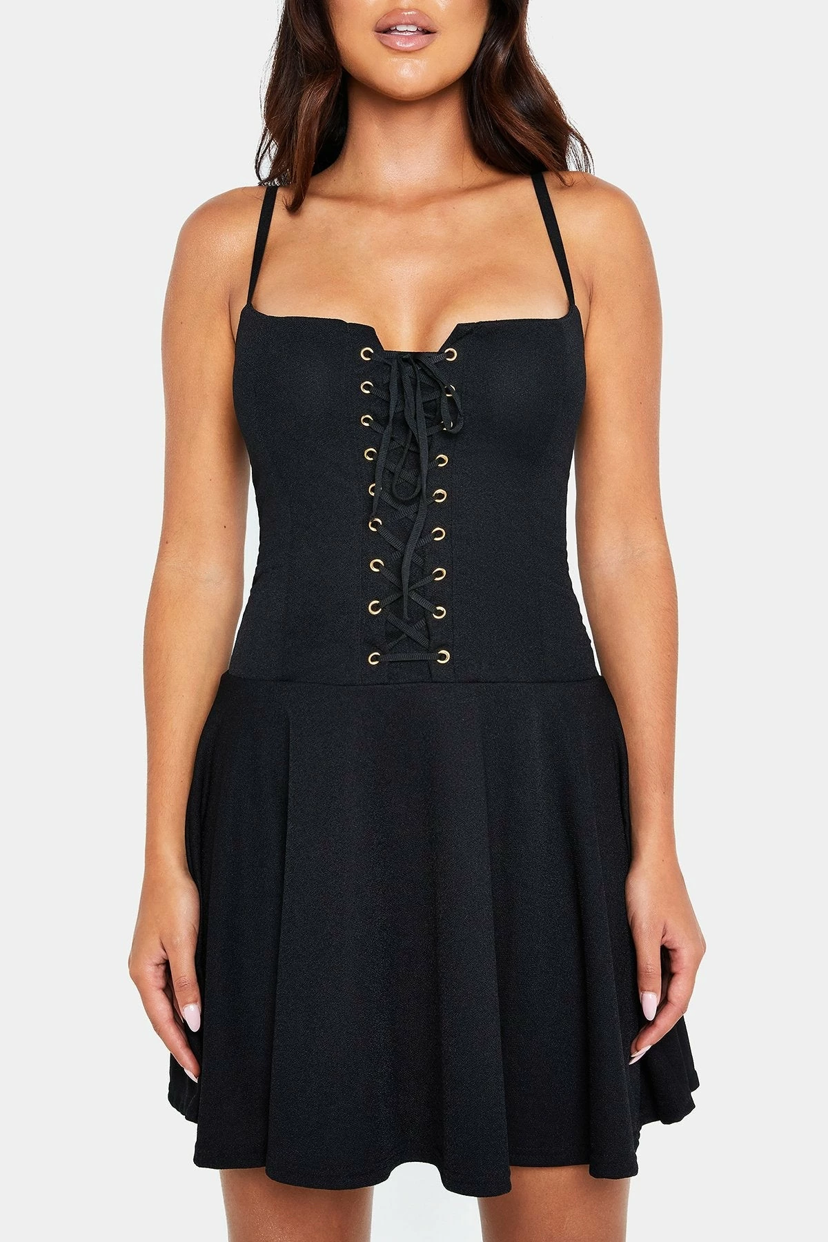 Solado Asymmetrical Neck Lace Up Front Mini Dress