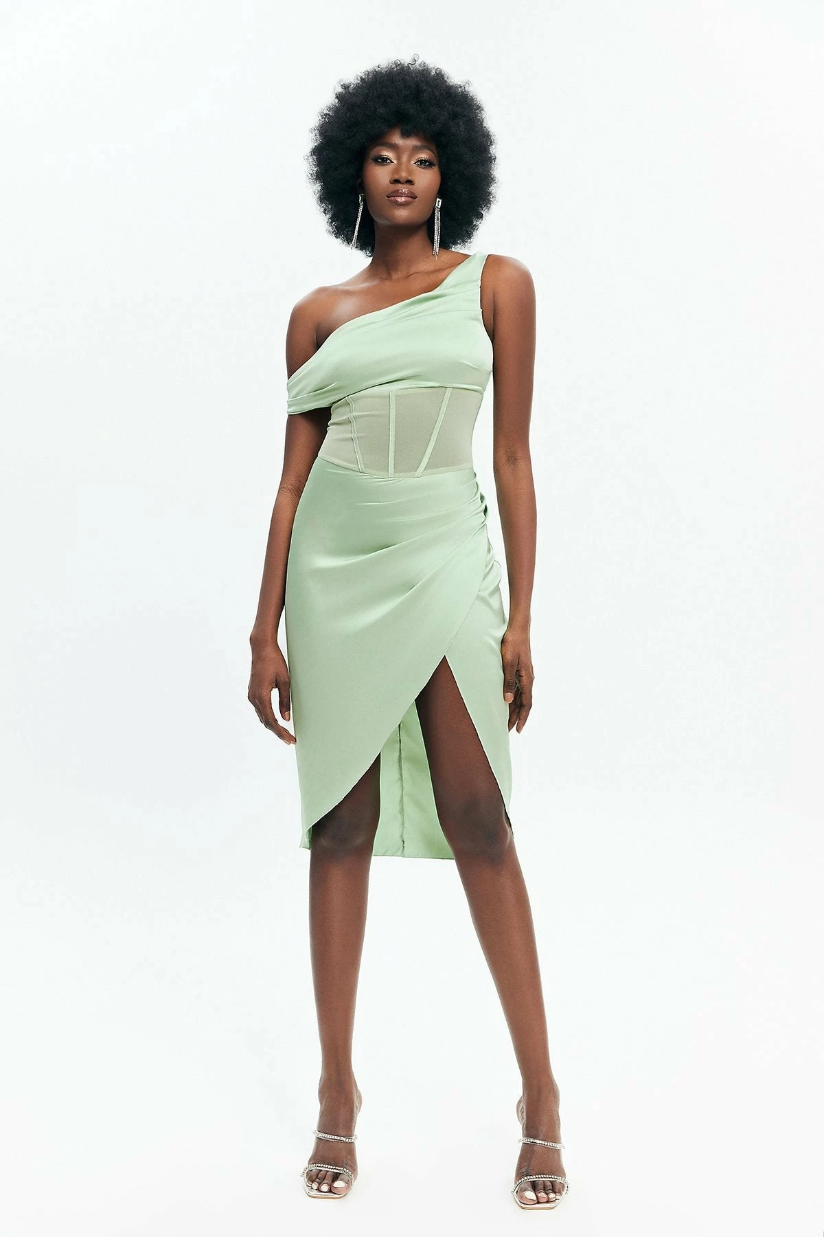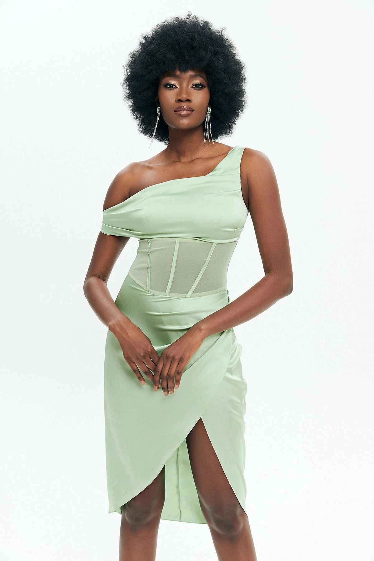 Solado Asymmetrical Neck Mesh Splicing Midi Dress