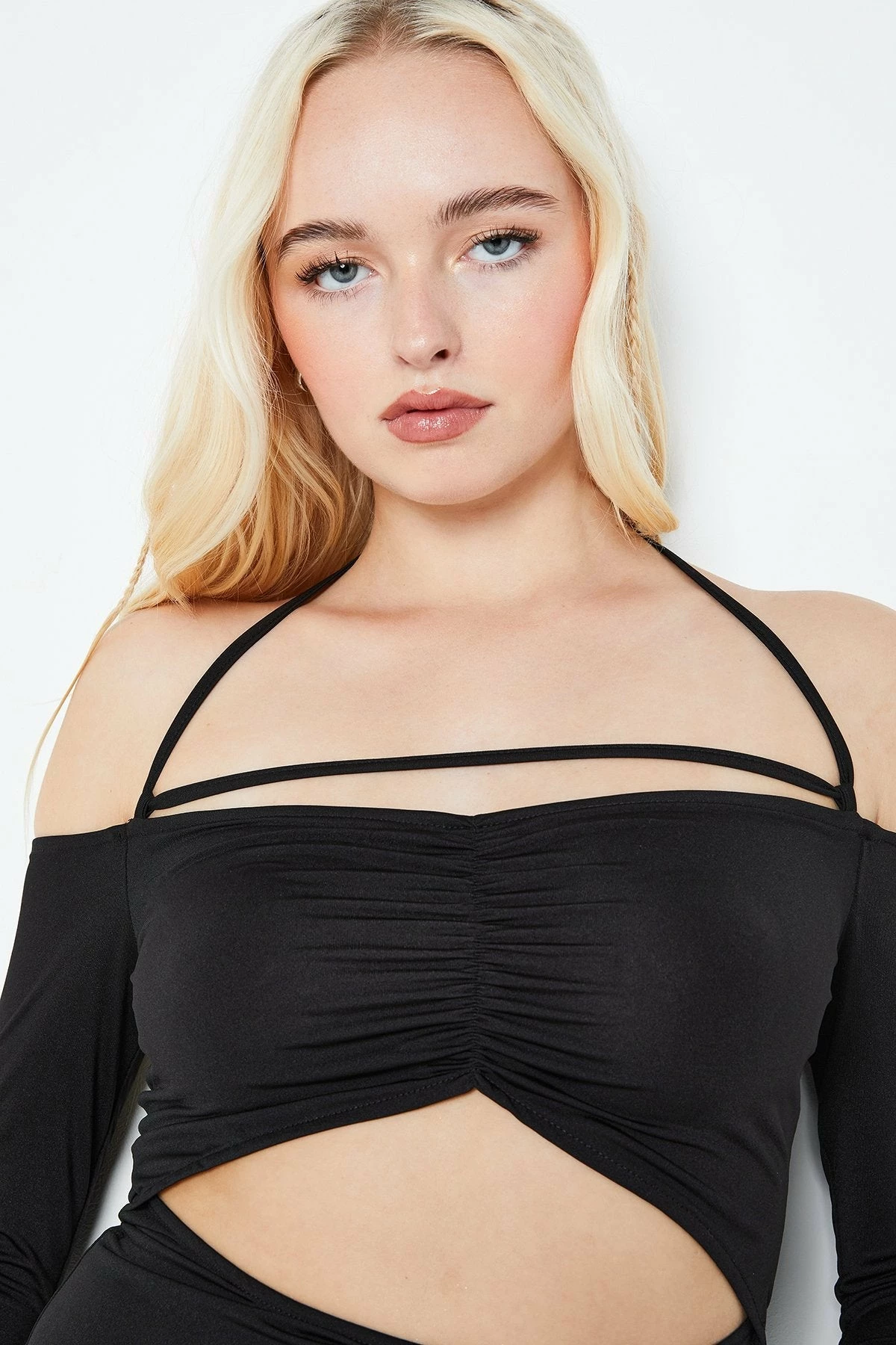 Style: Sexy Color: Black Neckline: Halter Neck Sleeve Length: Long Sleeve Hem Shaped: Slim Composition: 95% Polyester, 5% Spandex /td>
