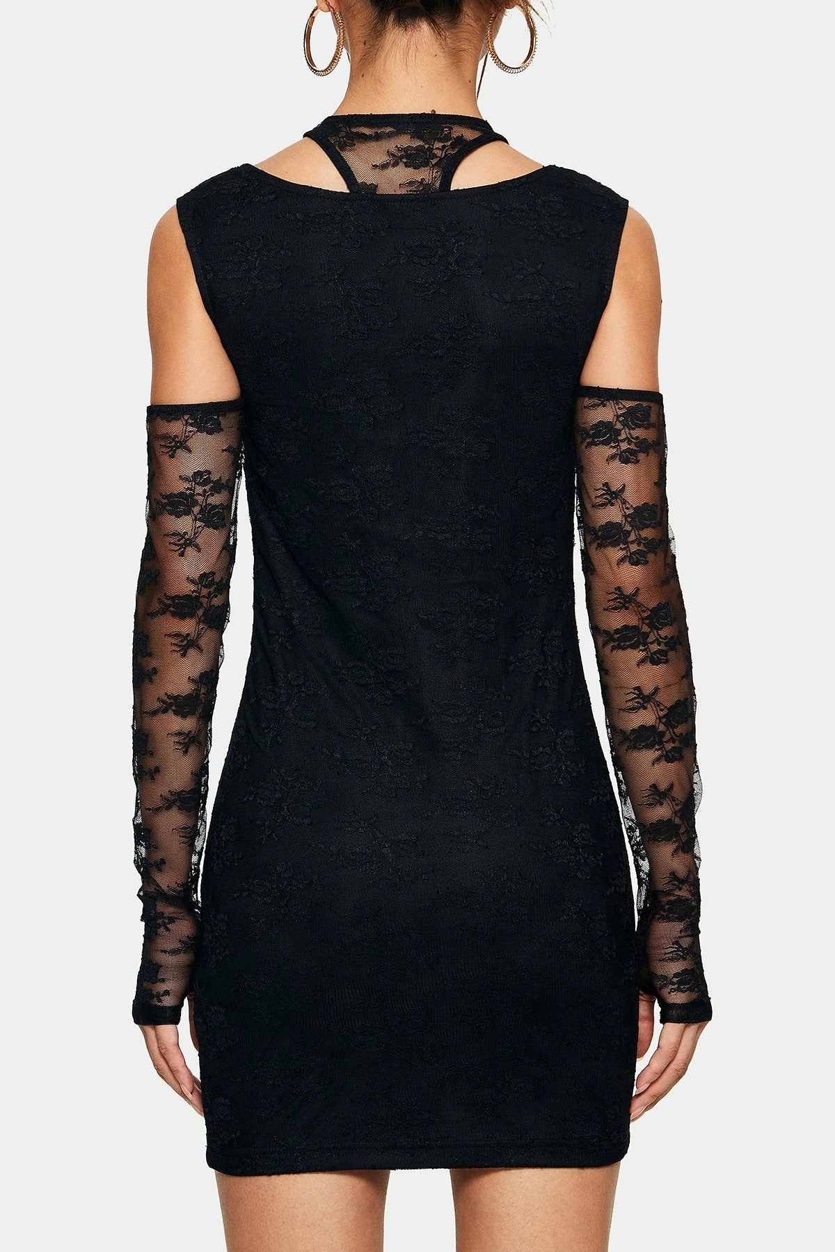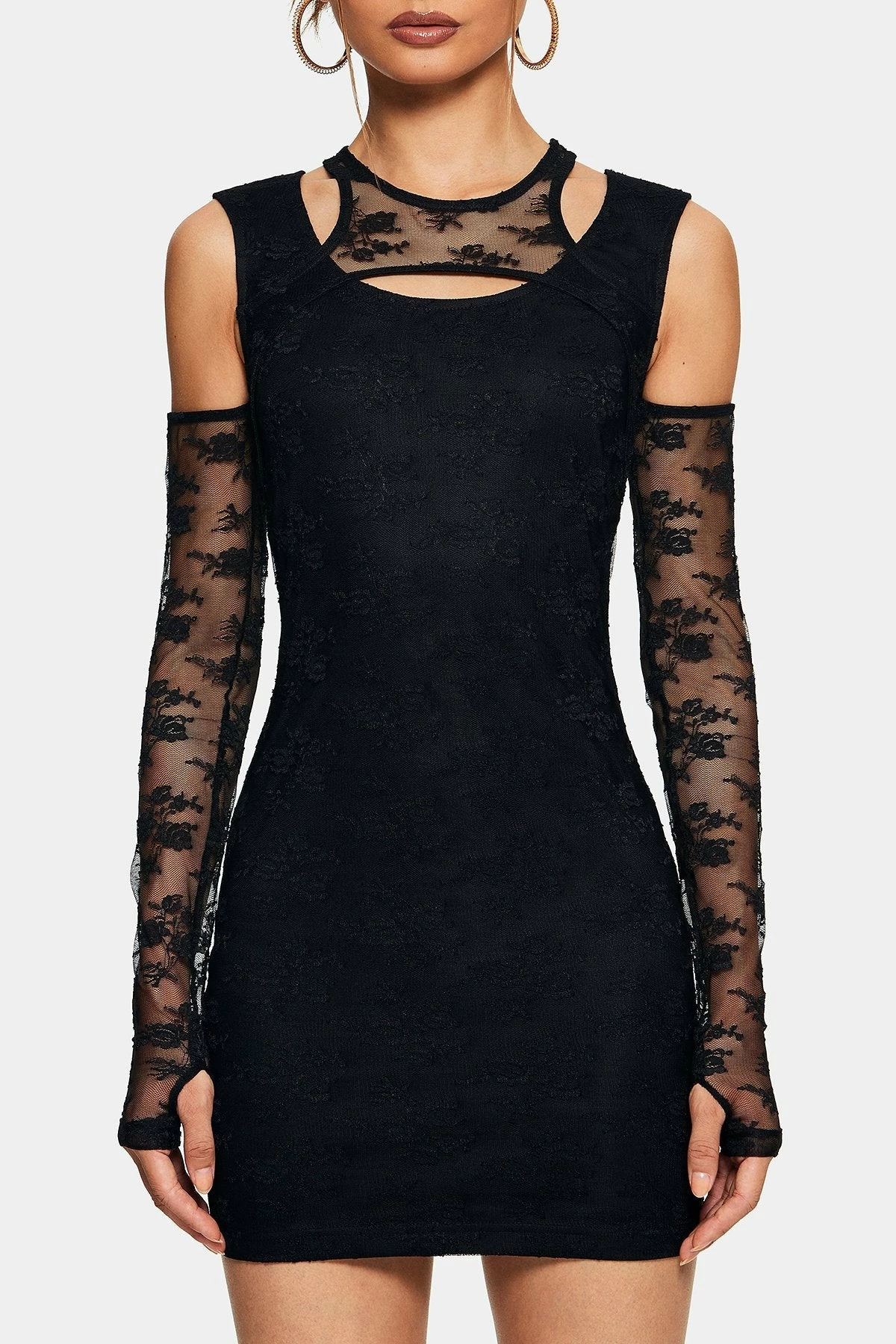 SOLADO Cold Shoulder Lace Splicing Long Sleeve Mini Dress