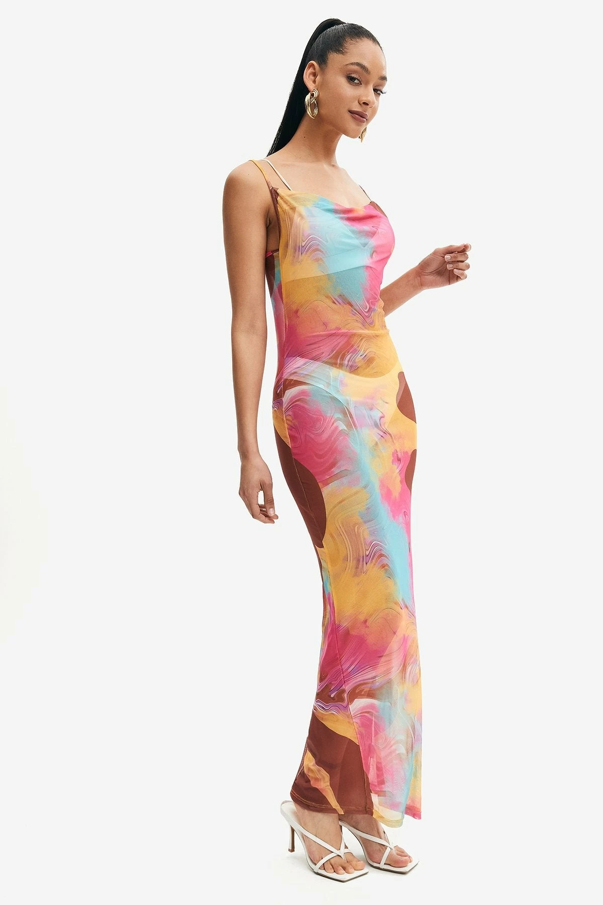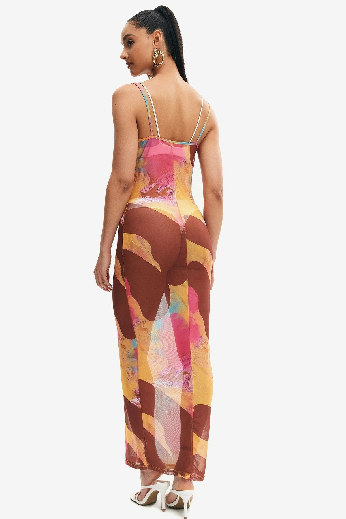 Solado Cowl Neck Abstract Print Mesh Maxi Dress Without Underwear