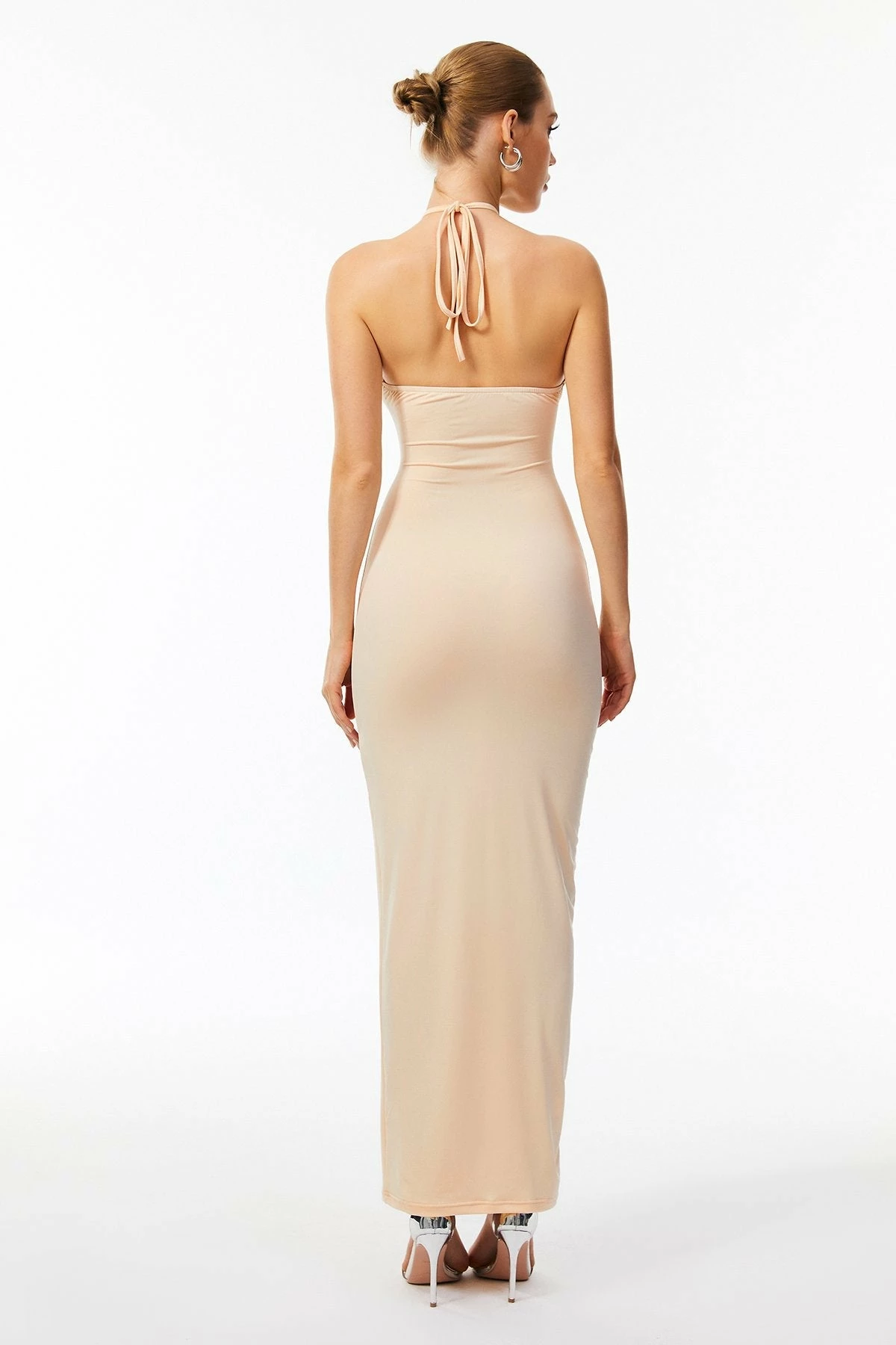 Style:SexyColor:BeigeSeason:Spring/Summer/AutumnNeckline:Halter NeckSleeve Length: SleevelessHem Shaped:SlimComposition:90% Polyester, 10% Spandex