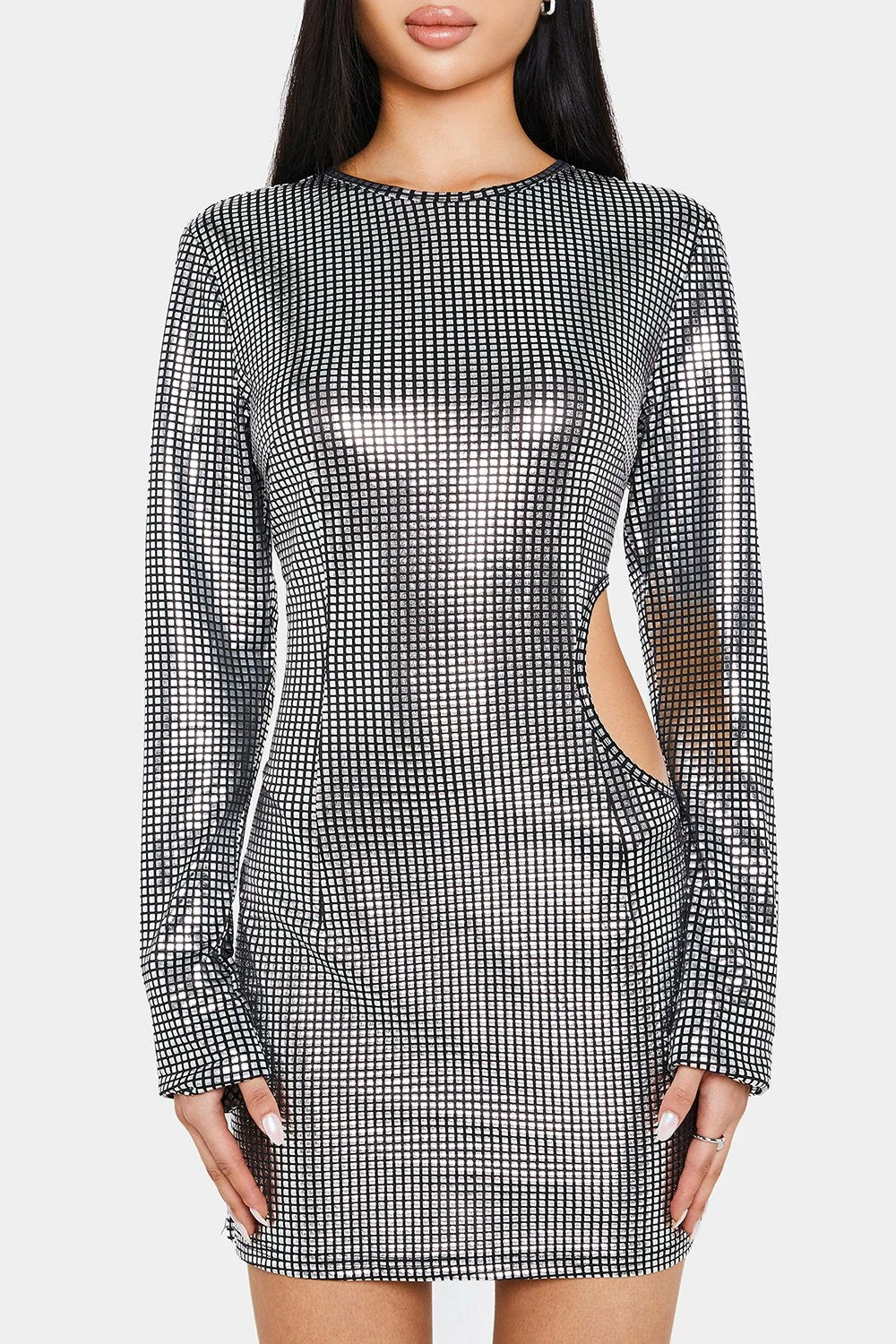 SOLADO Cut Out Split Hem Long Sleeve Sheen Mini Dress