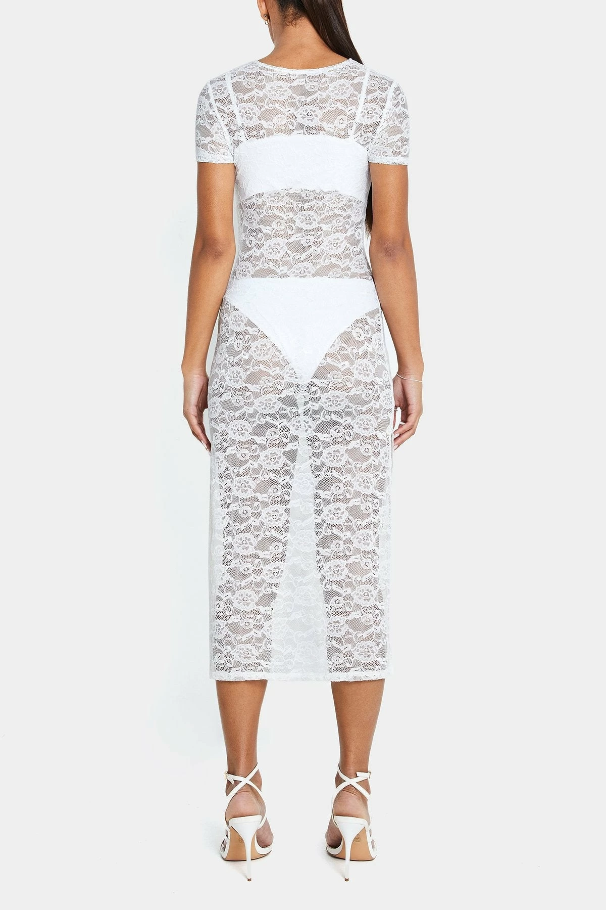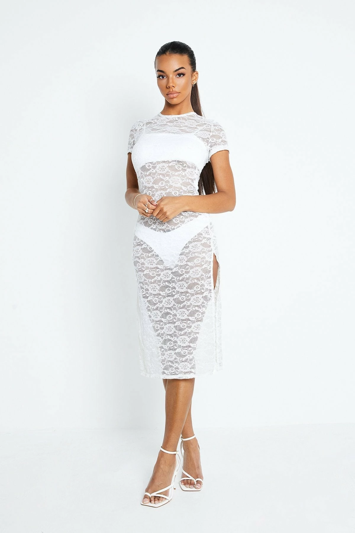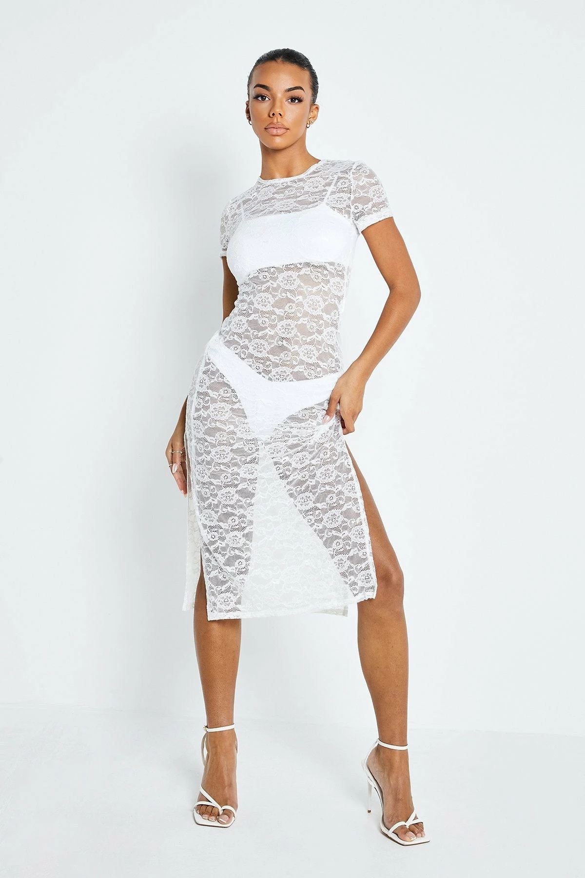 Solado Floral Lace Split Hem Short Sleeve Midi Dress Without Underwear