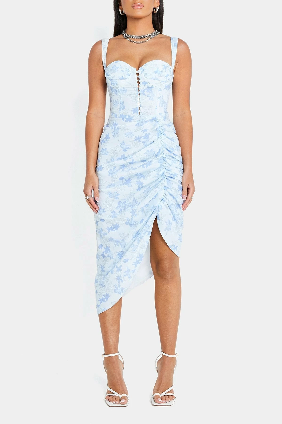 Solado Floral Print Button Front Asymmetrical Hem Midi Dress