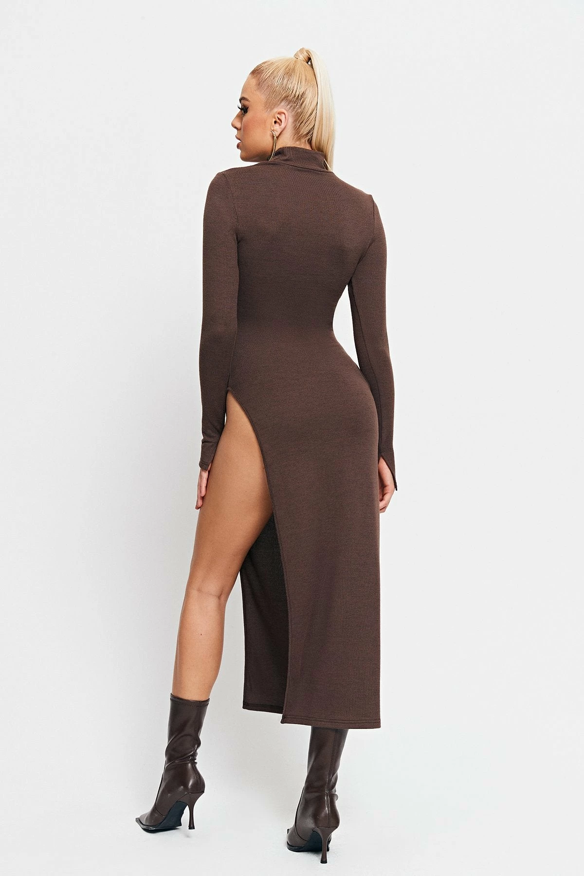 Style:ElegantColor:BrownNeckline:High NeckSleeve Length:Long SleeveHem Shaped:SlimComposition:95% Polyester, 5% Spandex
