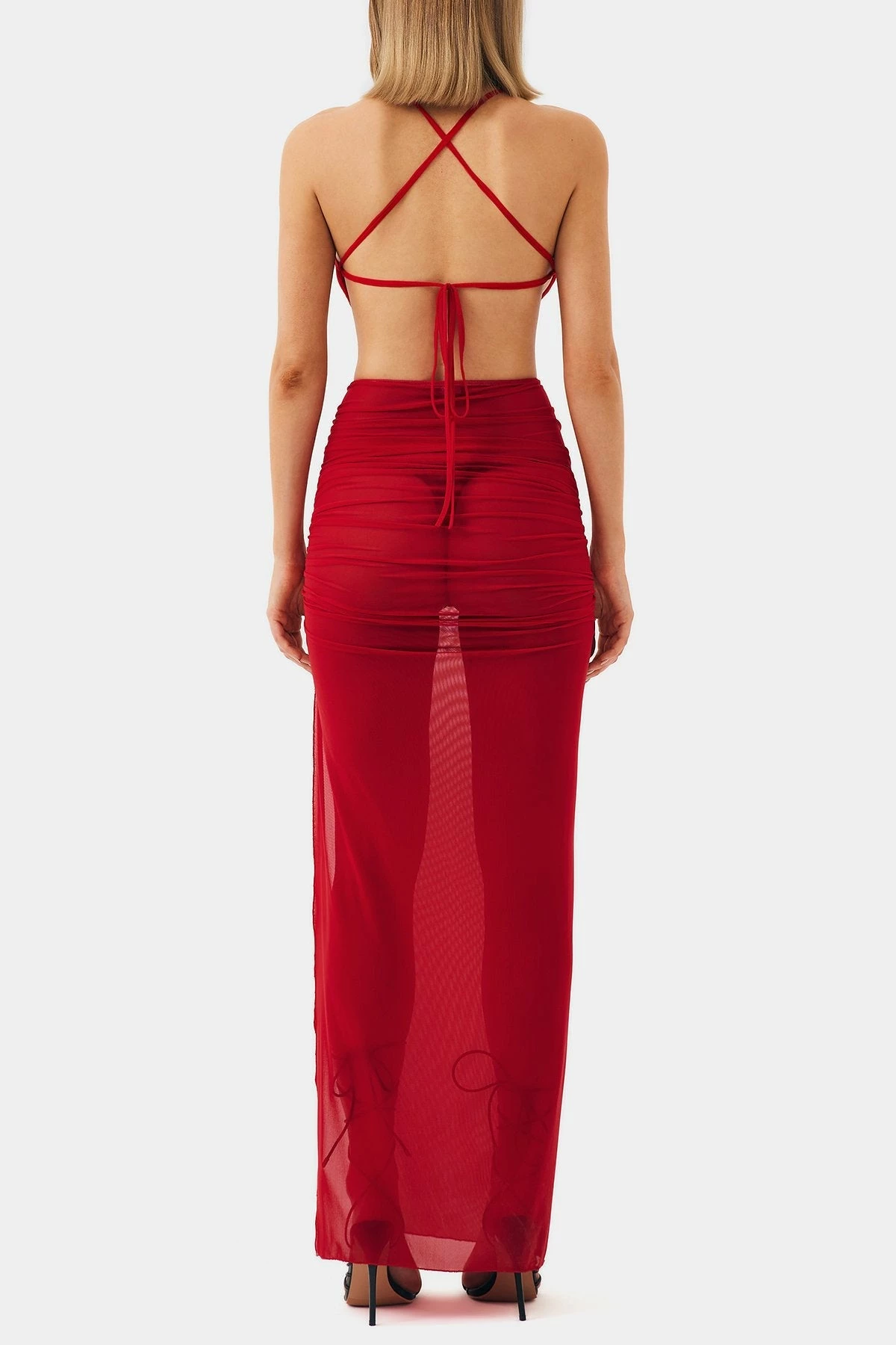 SOLADO Mesh Backless High Split Hem Maxi Dress