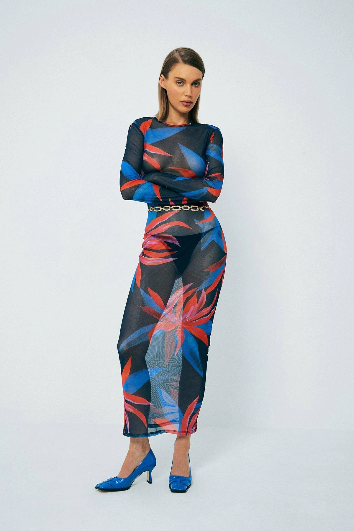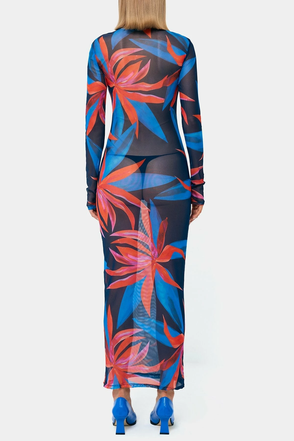 SOLADO Mesh Floral Print Long Sleeve Maxi Dress Without Waist Chain