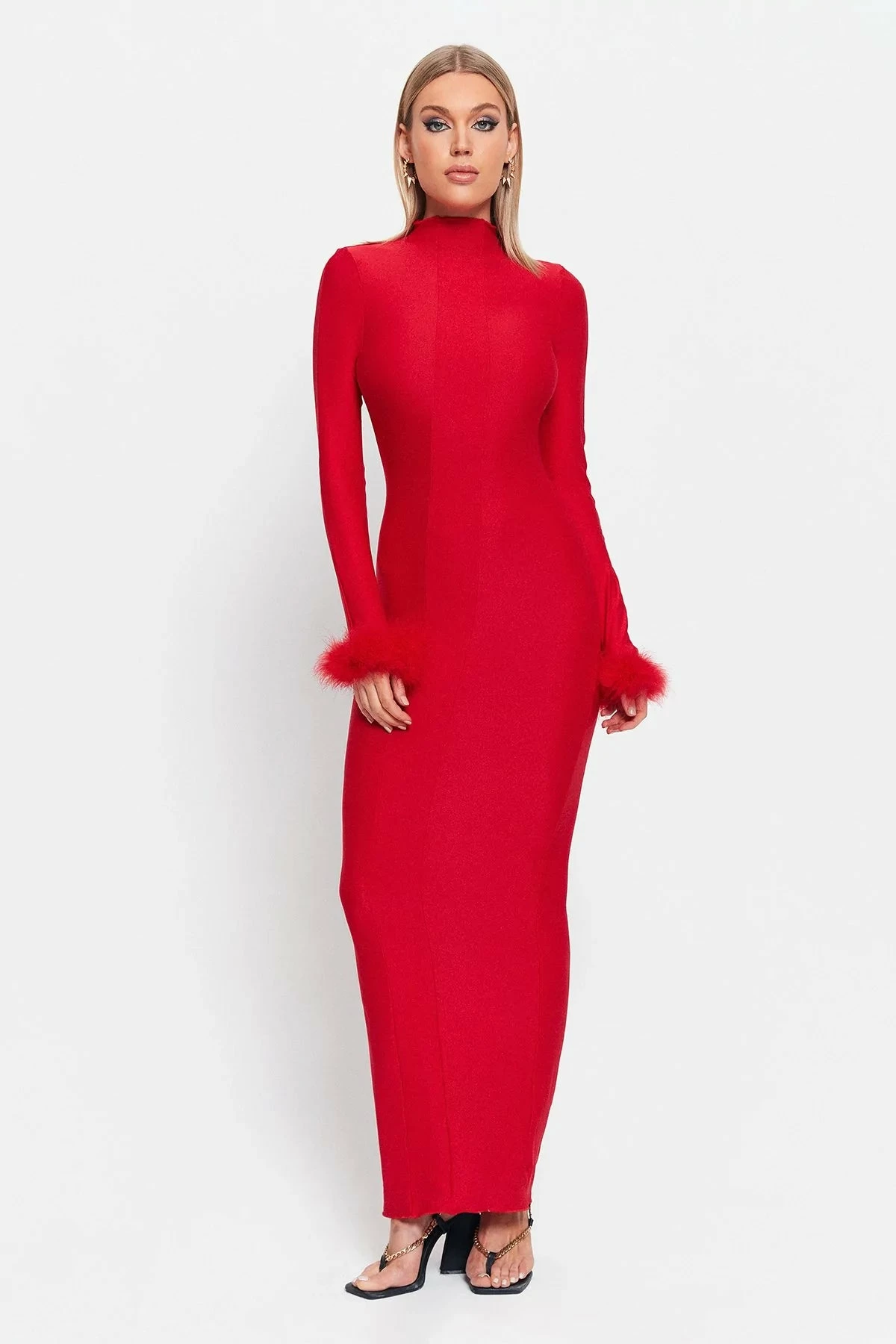 Solado Mock Neck Feather Trim Open Back Maxi Dress