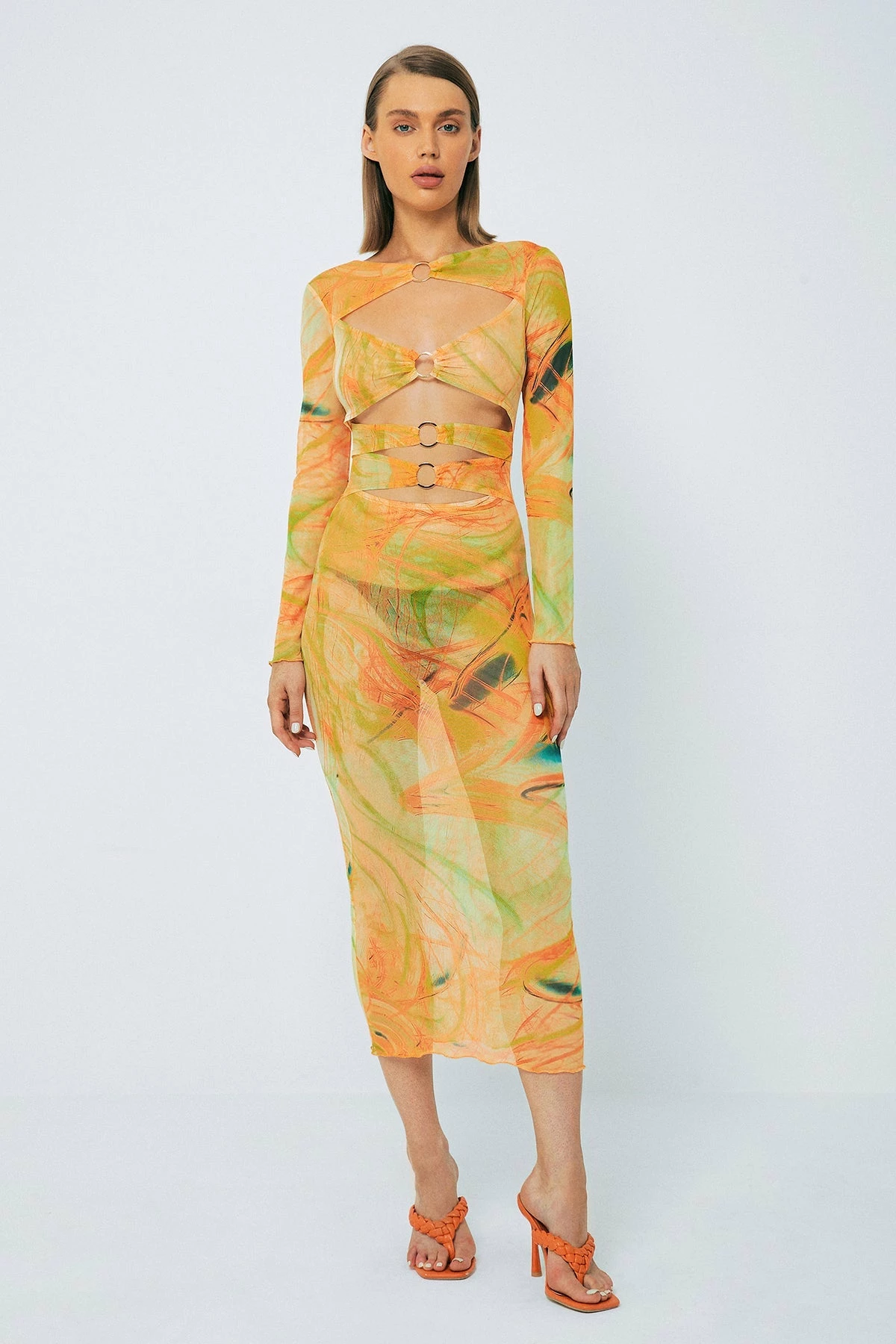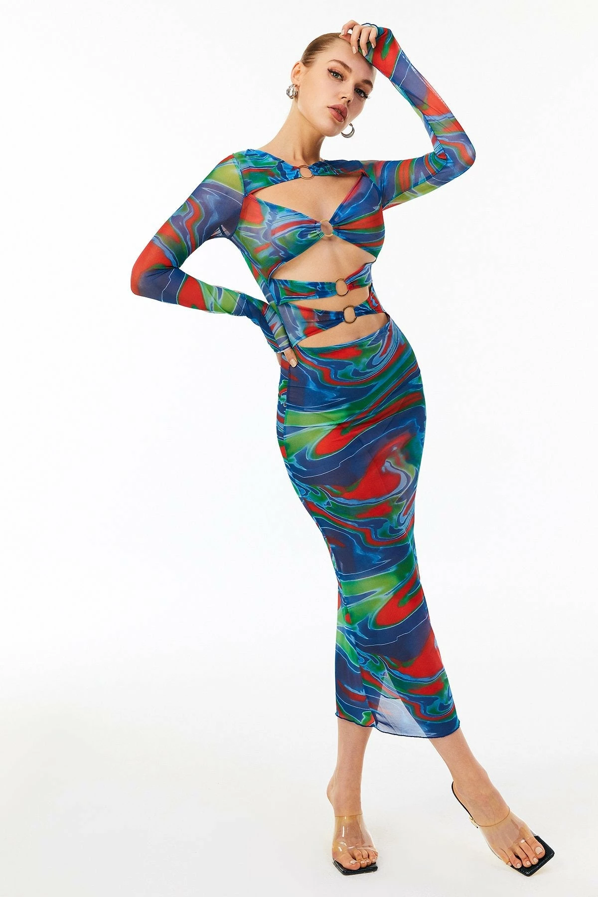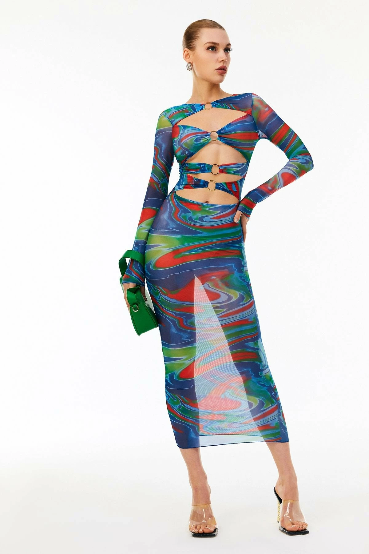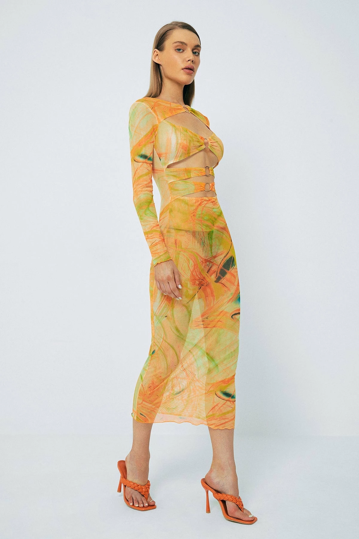 Solado O-Ring Cut Out Abstract Print Mesh Maxi Dress