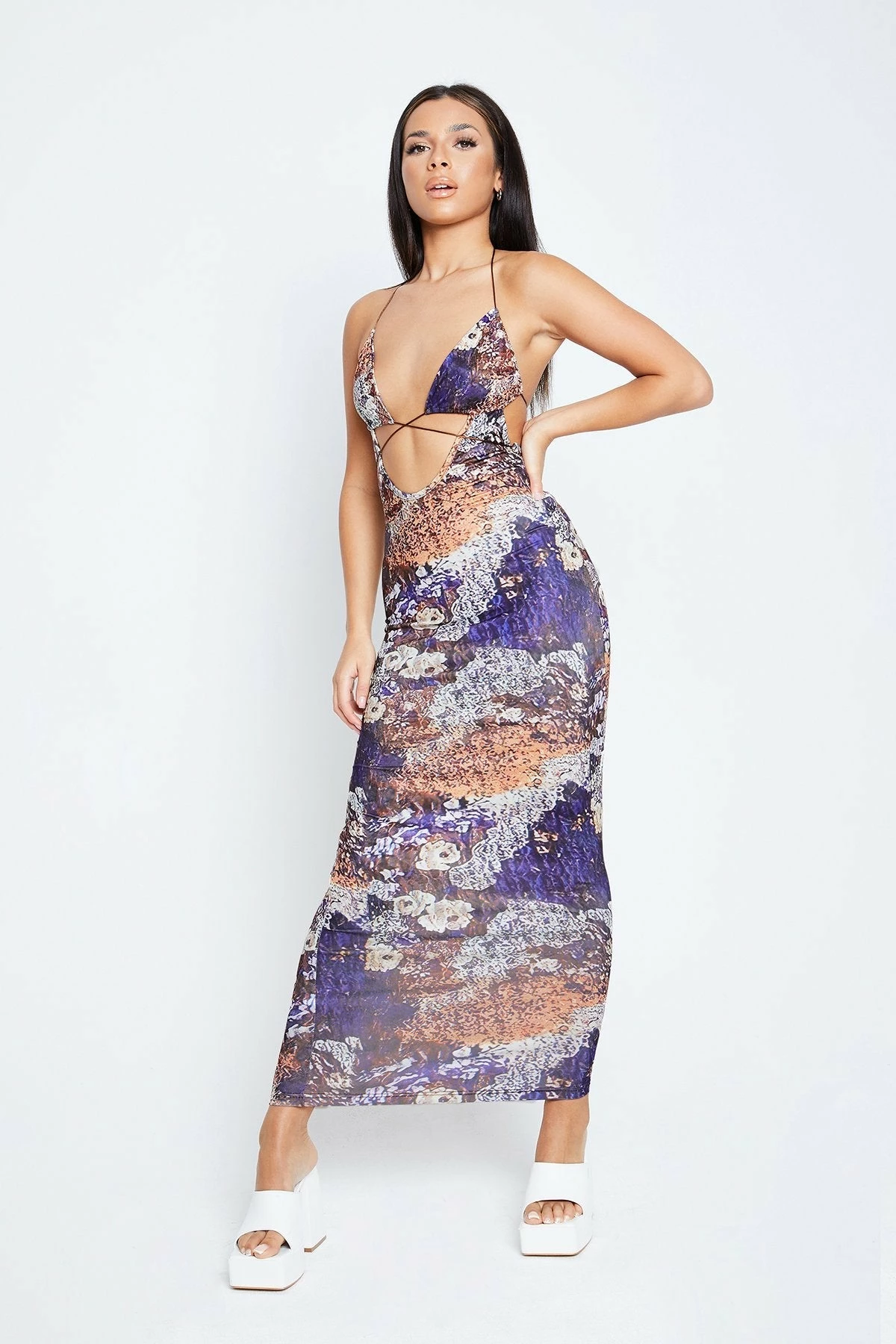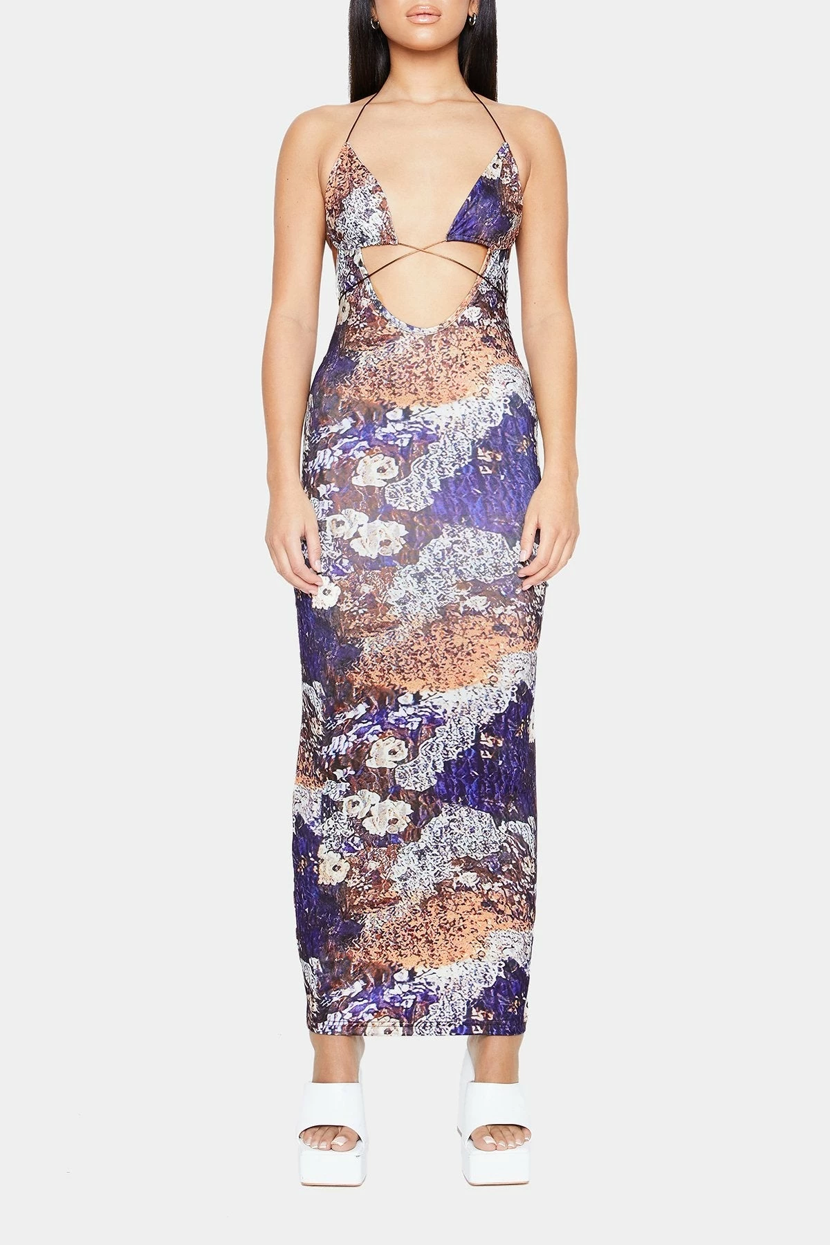 Solado Plunging Neck Abstract Print Open Back Maxi Dress