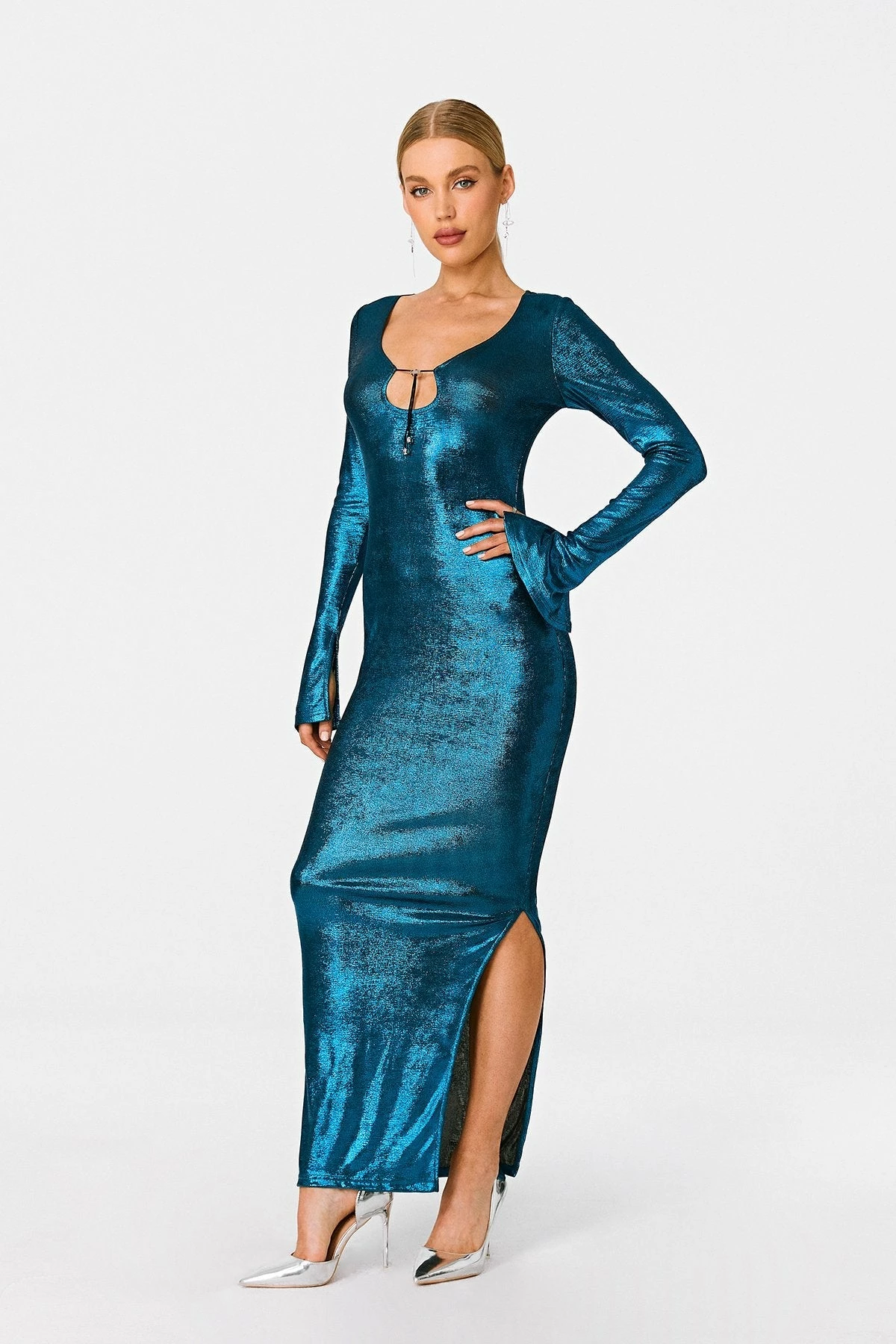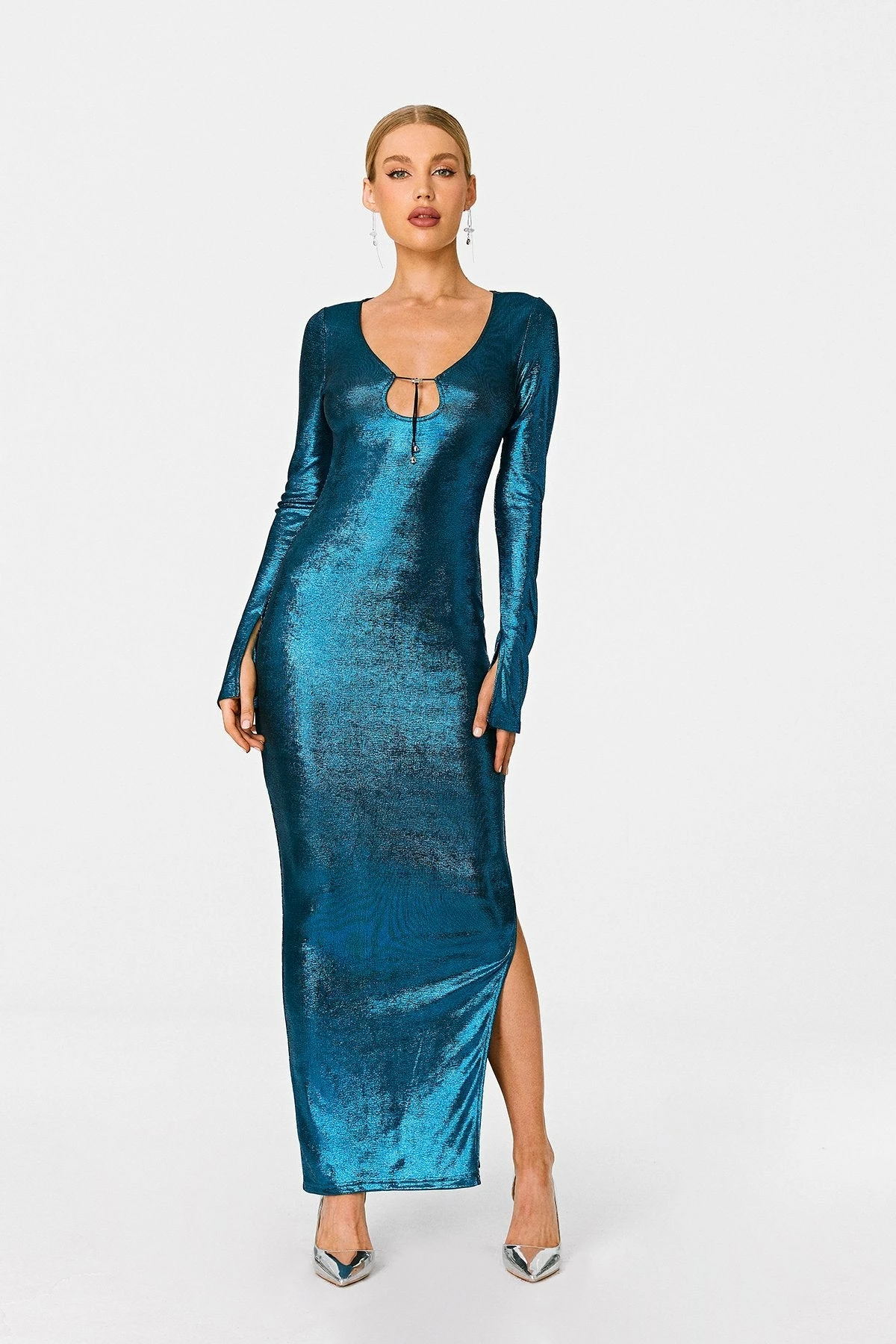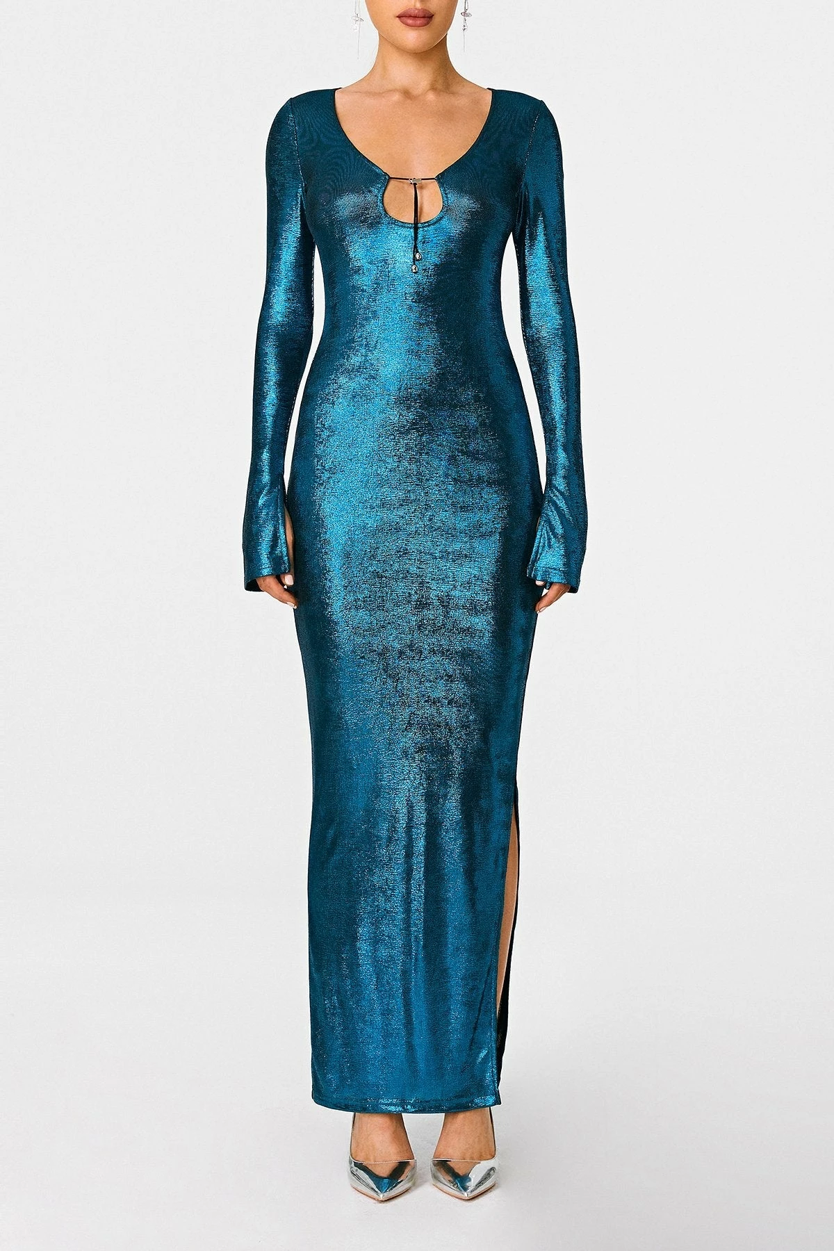 SOLADO Plunging Neck Tie Front Split Hem Sheen Maxi Dress