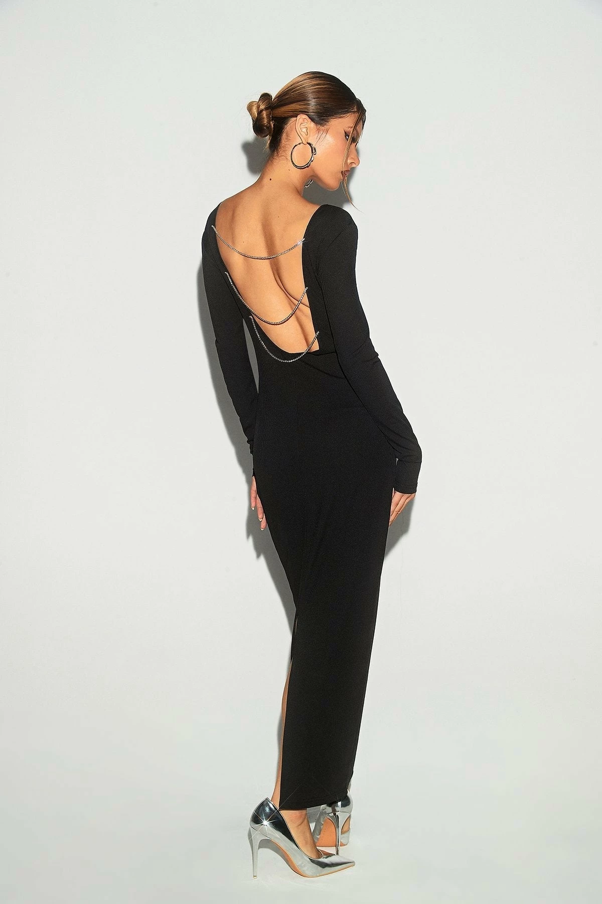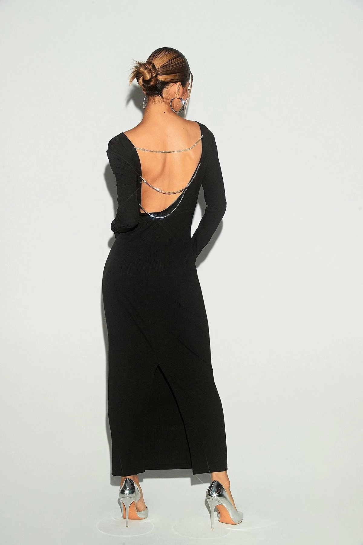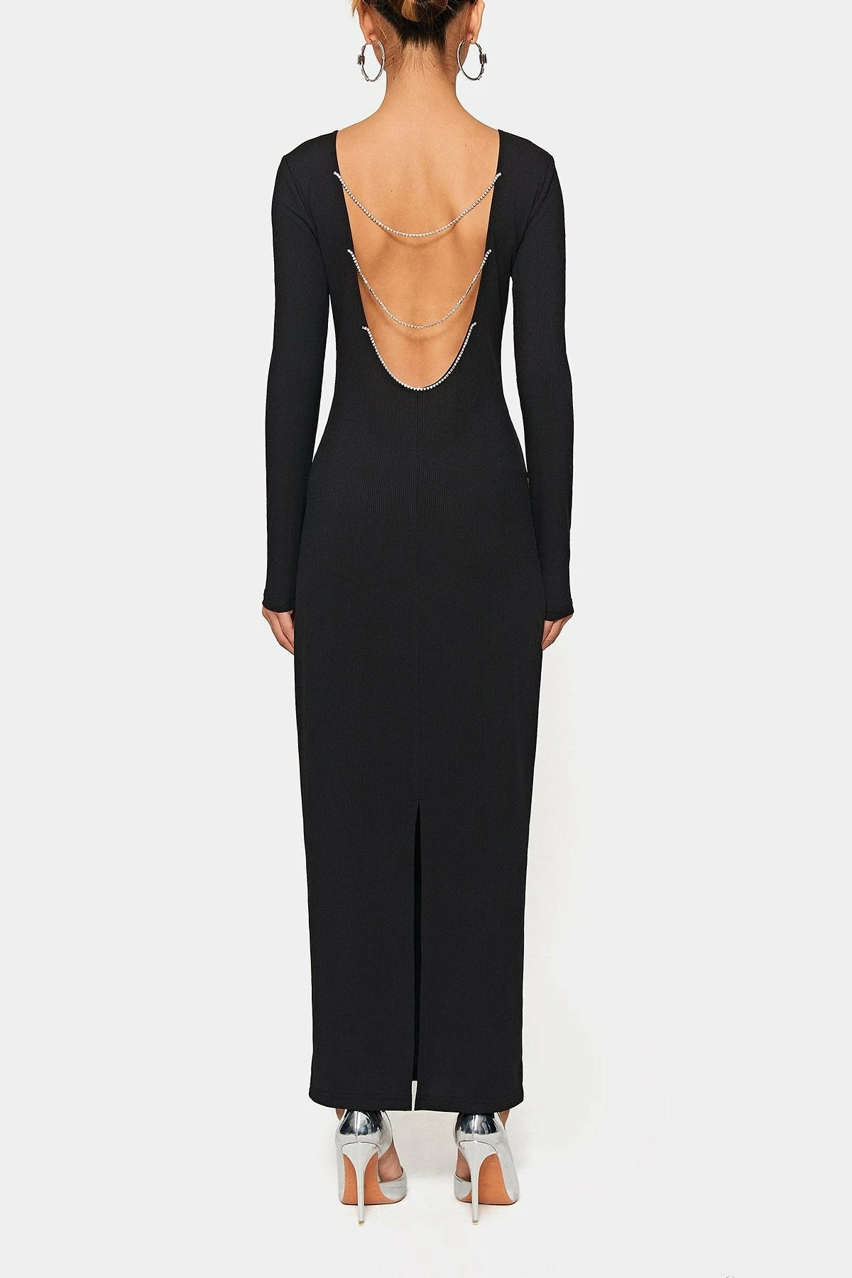 SOLADO Rhinestone Chain Decor Open Back Maxi Dress