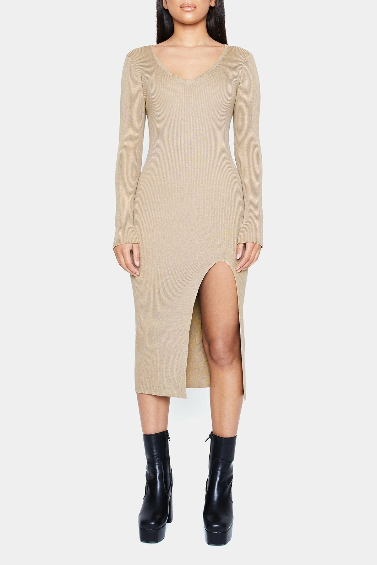 Solado Ribbed Knit Split Hem Long Sleeve Sweater Dress