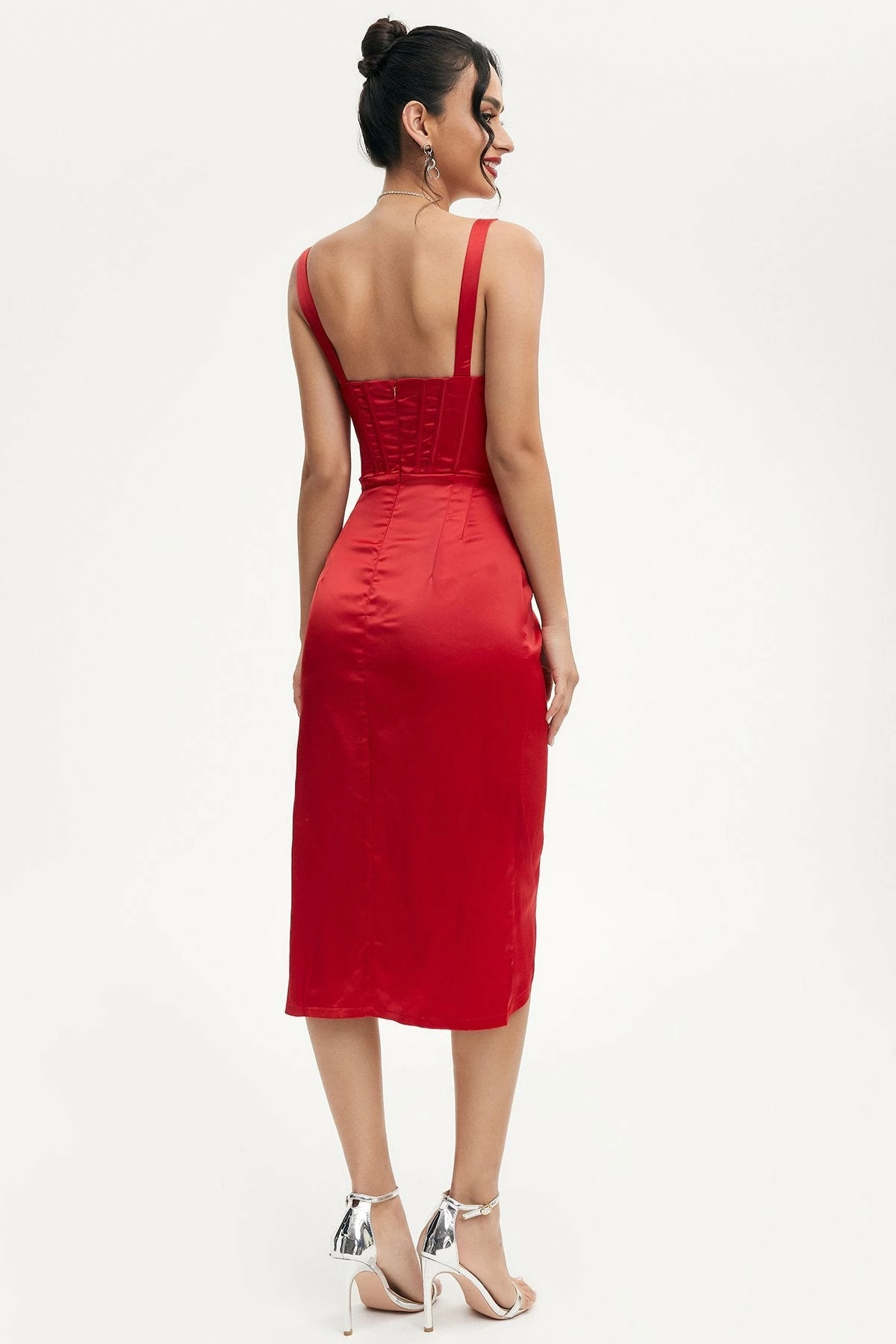 Solado Satin Plunging Neck Boning Split Hem Midi Dress