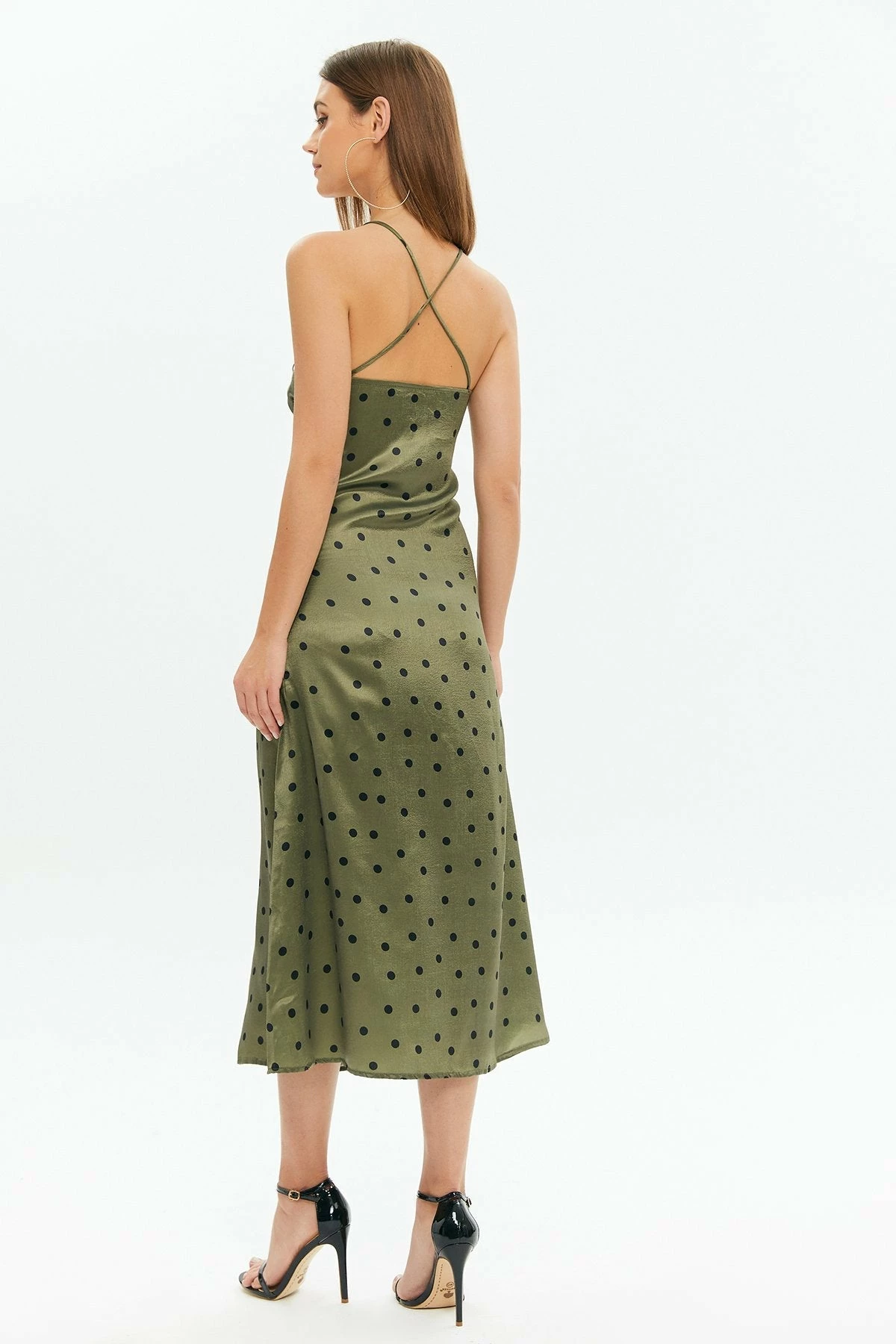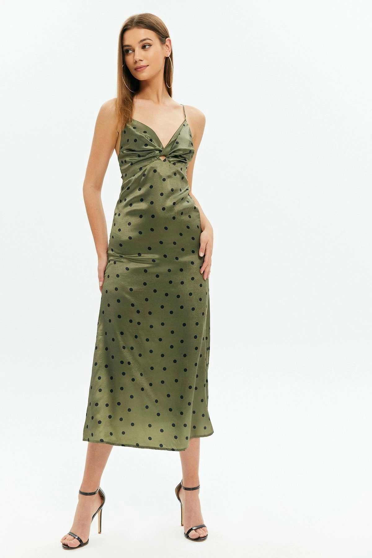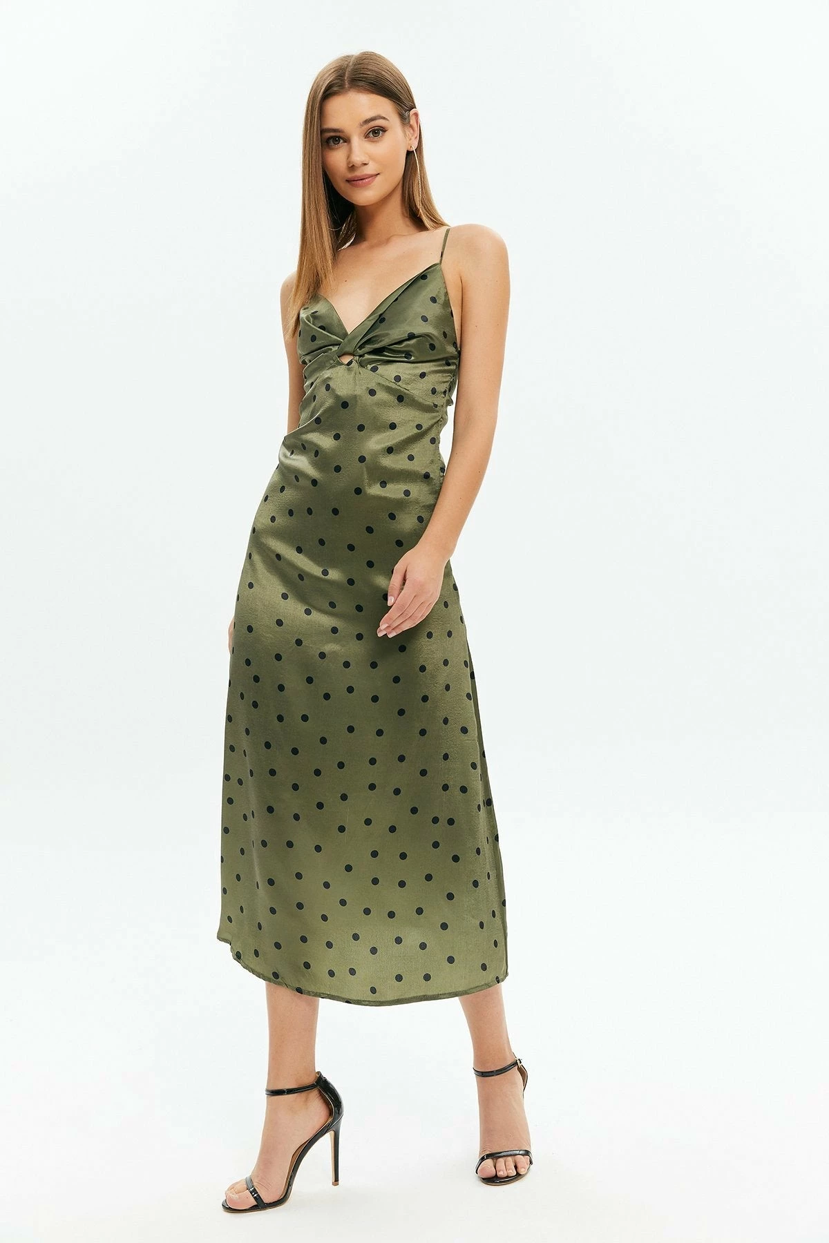 Solado Satin Polka Dot Twist Front Backless Midi Dress