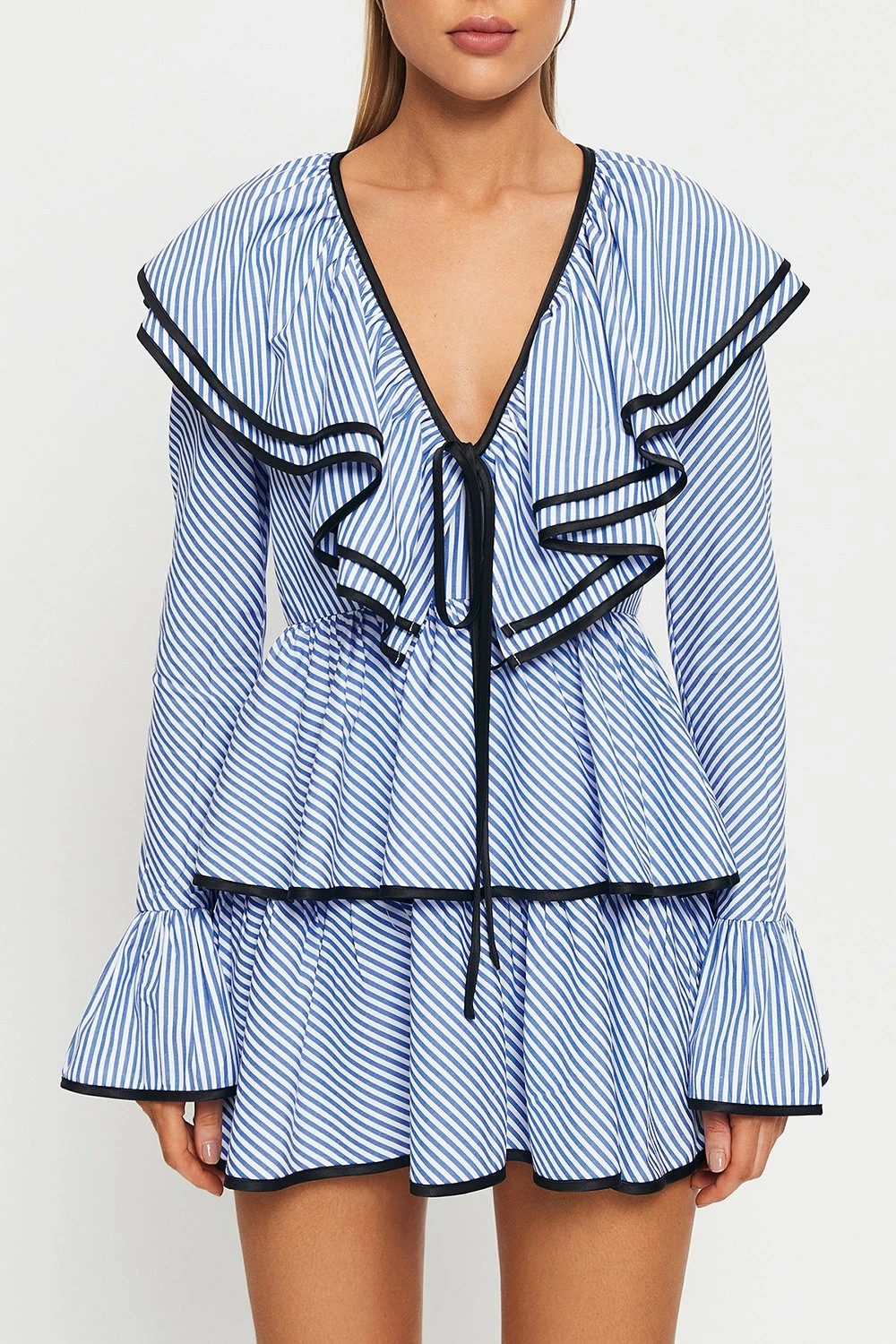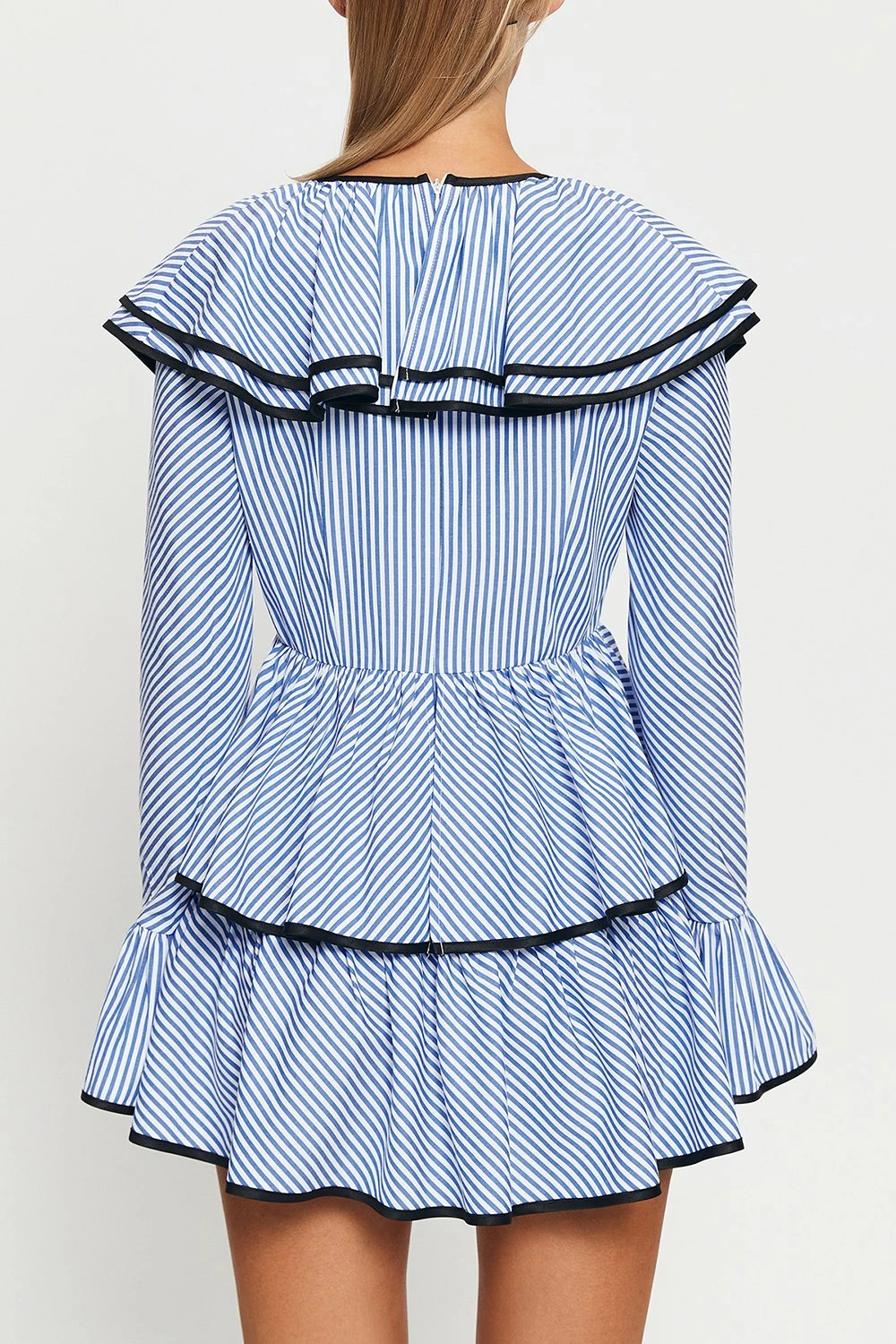 SOLADO Striped Print Colorblock Trim Ruffle Layered Mini Dress