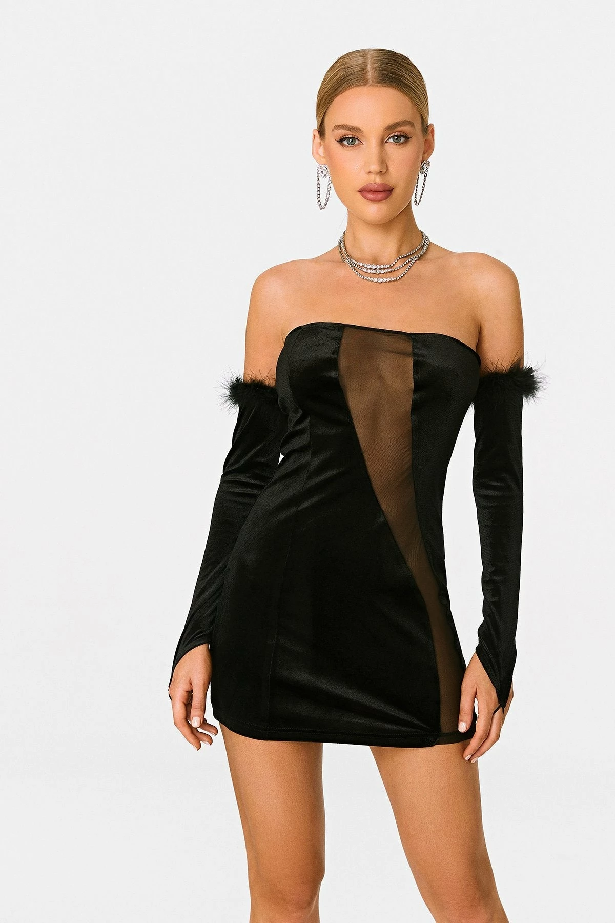 SOLADO Velvet Off Shoulder Mesh Splicing Mini Dress With Oversleeve