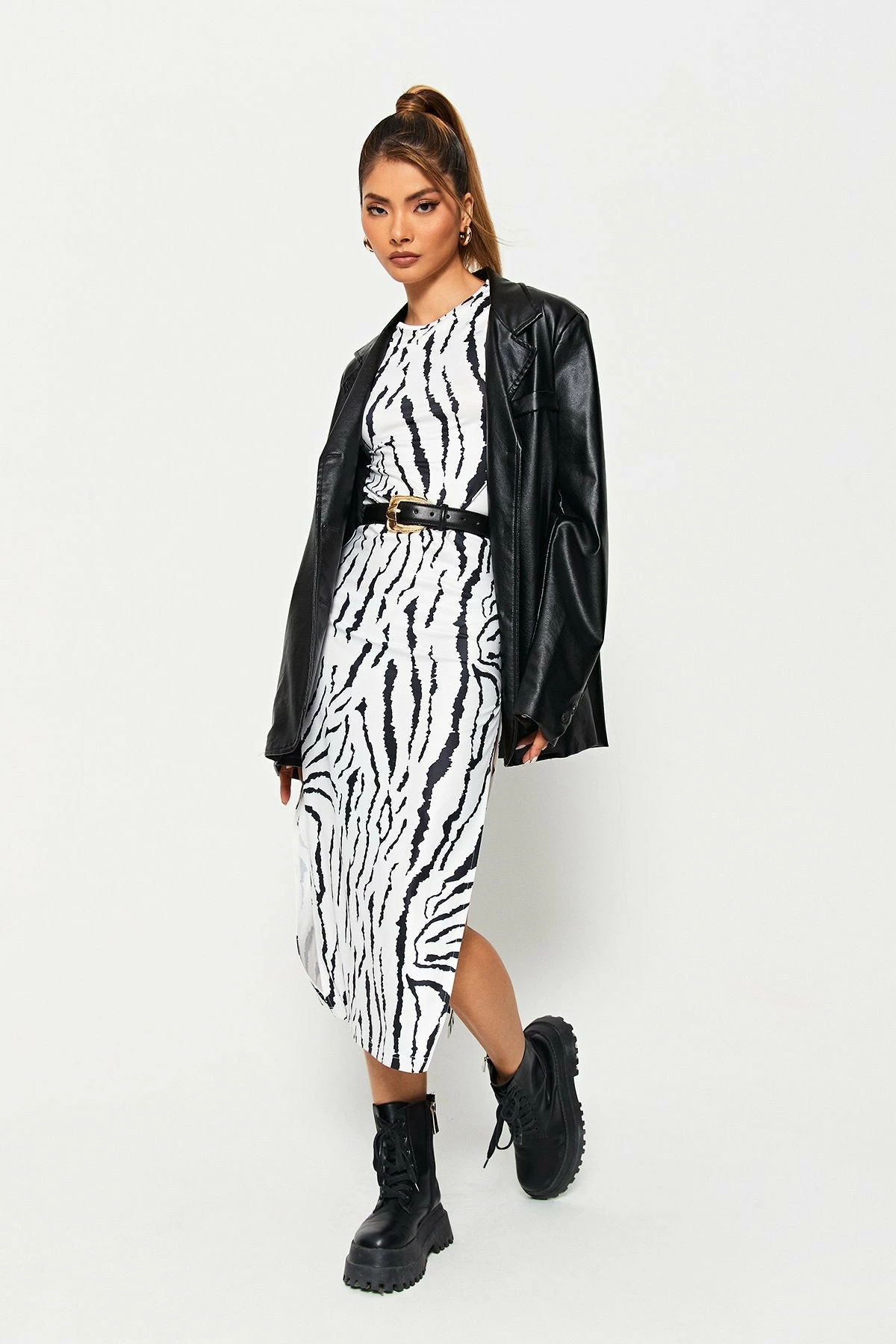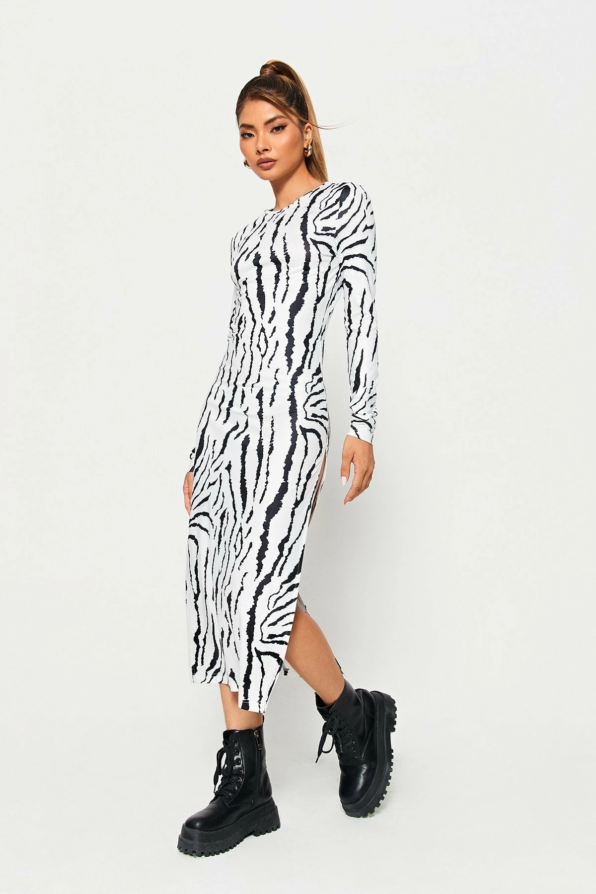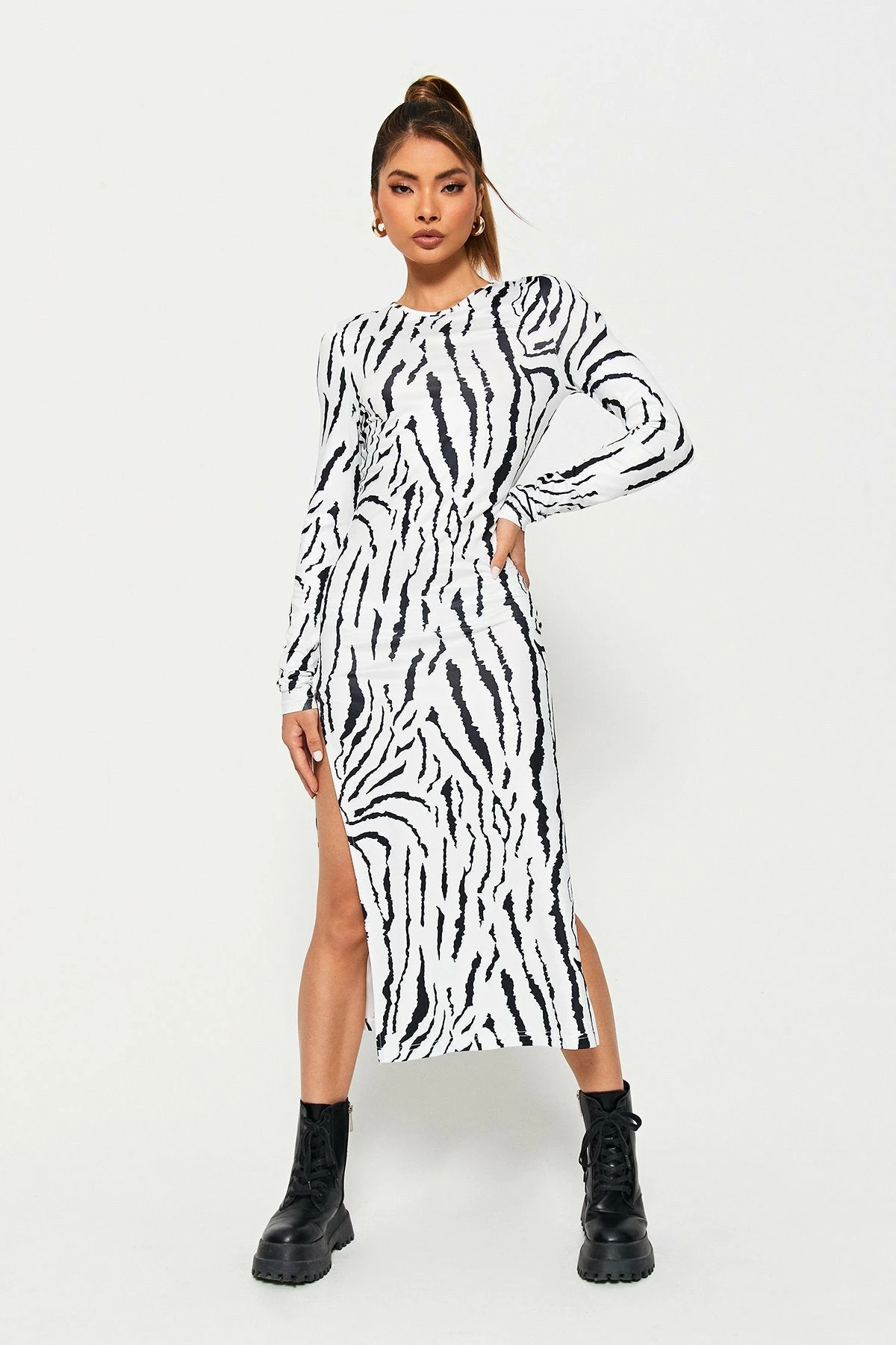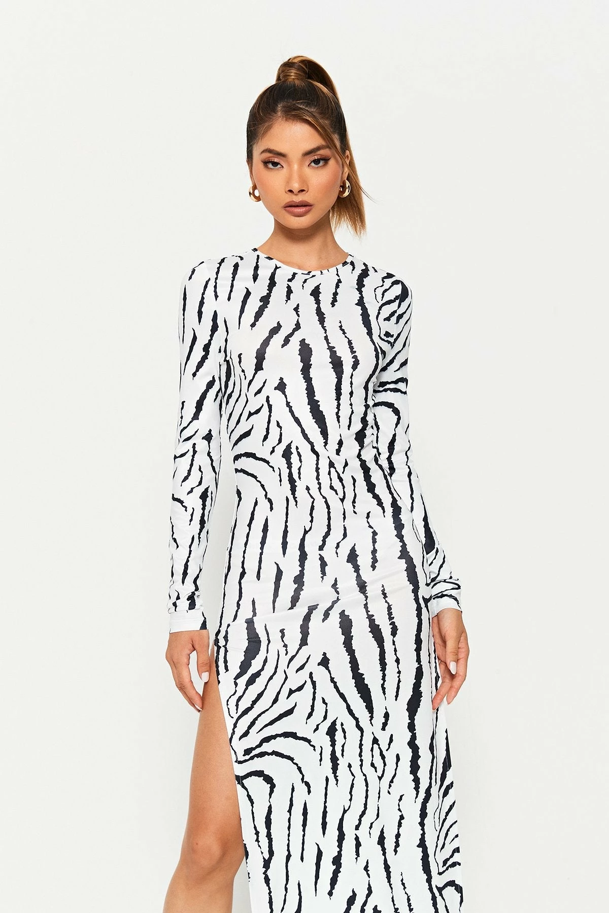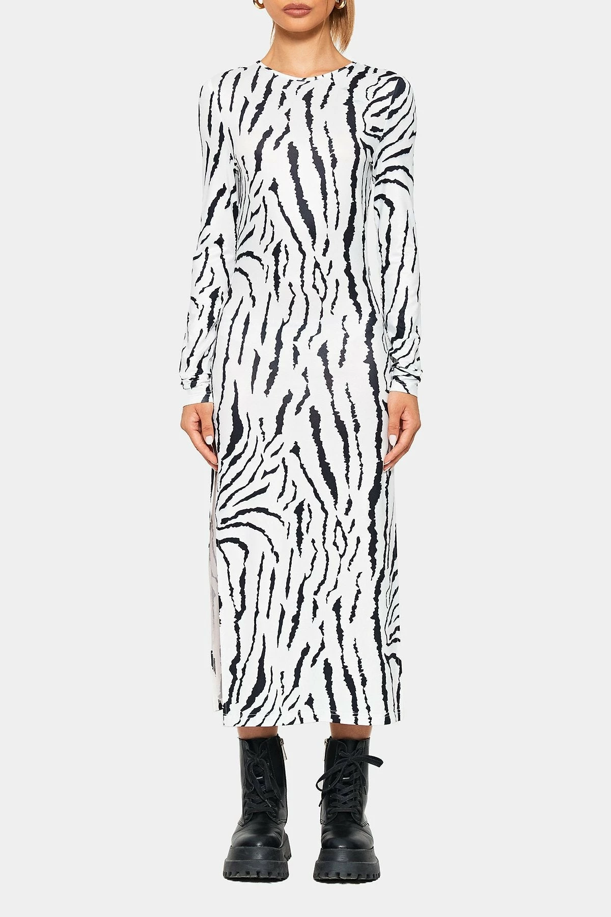 SOLADO Zebra Print Split Hem Long Sleeve Maxi Dress